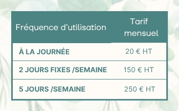 Les postes de travail sont loués par les entreprises sur la base de convention annuelle pour une utilisation continue, bihebdomadaire ou à la journée. La fréquence est définie préalablement et la facturation se réalise au mois.